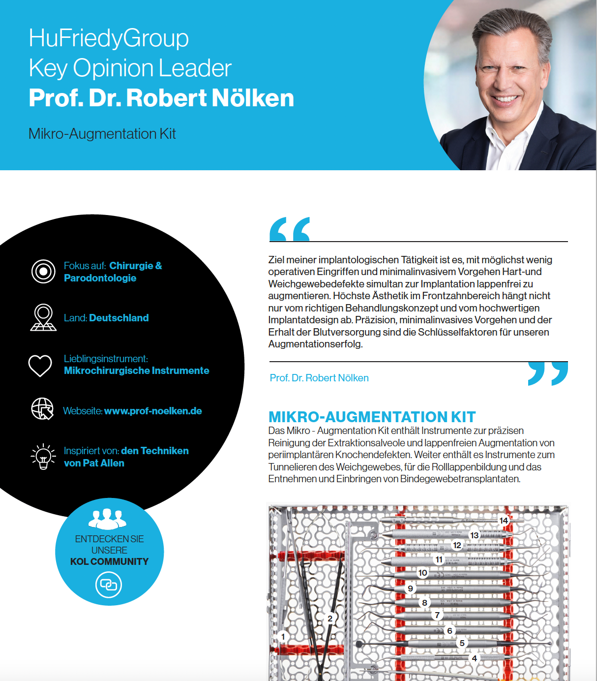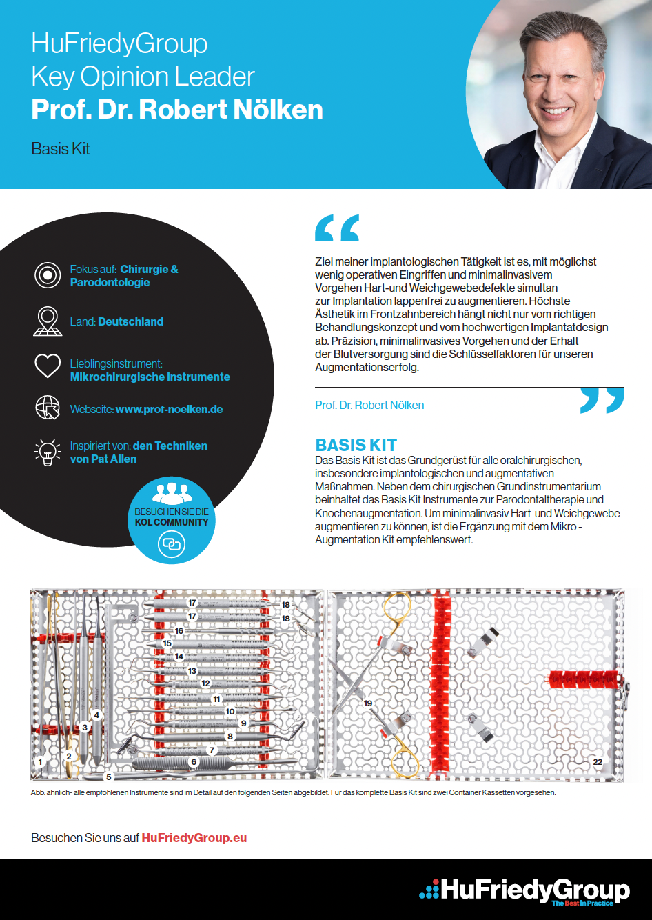 Das Basis Kit ist das Grundgerüst für alle oralchirurgischen, insbesondere implantologischen und augmentativen Maßnahmen. Neben dem chirurgischen Grundinstrumentarium beinhaltet das Basis Kit Instrumente zur Parodontaltherapie und Knochenaugmentation.